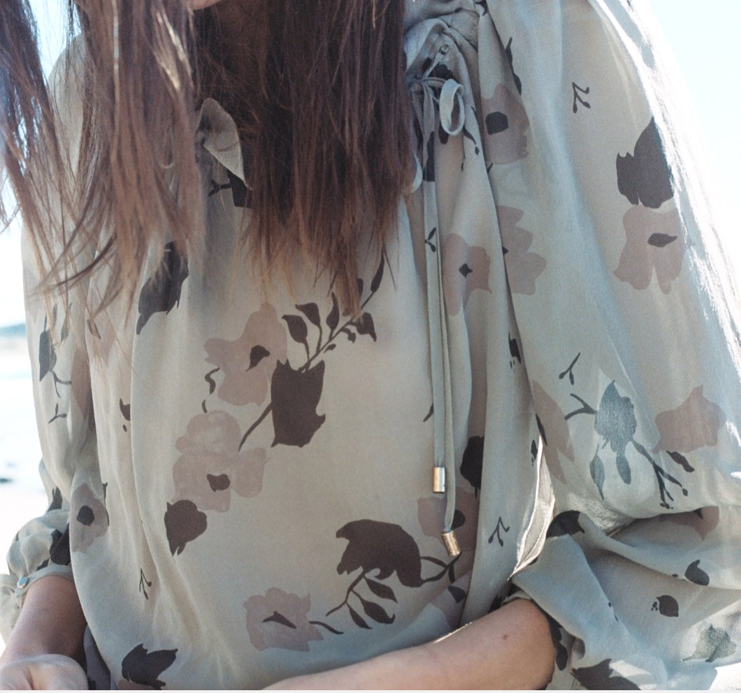 Voluminous and romantic. The Alva top in airy silk chiffon and our exclusive lake flower print. Asymmetric draw cord neckline allows for wearing pulled in or more relaxed on the shoulders. Gold cord end detail. Sleeves are wide and billowed. Fine cuff at wrist. Hem finishes at hip.