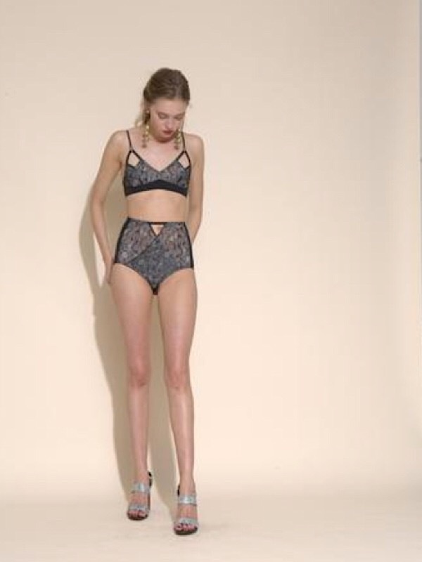Ingrid Starnes famously comfortable lingerie in a romantic lace and power mesh. These beautiful knickers sit gently on the natural waist. Two overlapping pieces of lace create a triangle cut out at the top, front waist. The back panel is a wonderfully comfortable power mesh. Pairs perfectly with the Juni bra.