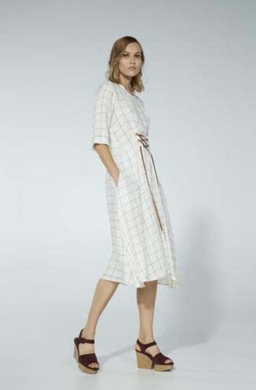 The Ottoline dress in light, summer weight 100% cotton. Rounded neck, sleeves reach the elbow. Eyelet waist detail ties with brown leatherette to create shape and pleat detail in skirt. Falls to just below the knee.