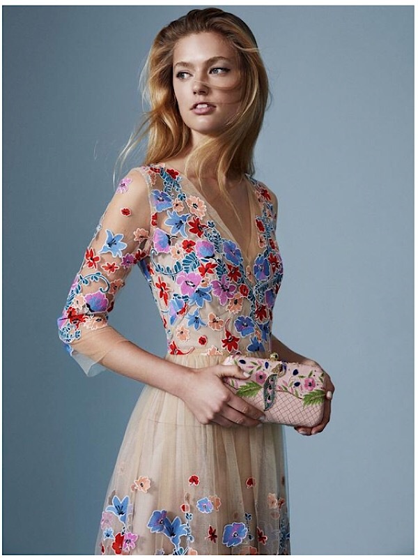 The Tuileries dress is the perfect dress to brighten up any spring day featuring a ¾ sleeve, deep v-neckline and a mid-length gathered skirt with floral embroidery covering the majority of the dress it is worn over a Stretch satin slip, with added tulle for volume.