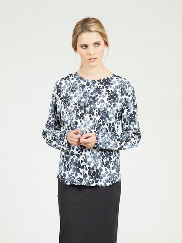 Round neck top with seam and top stitching up centre front. Key hole opening at back neck and curved hem. Loose fitting through body with curved cuffs on sleeves.