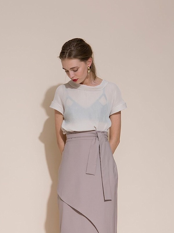 The Akiko needle top in a textural, sheer pleat. Soft boat neck collar traces to the back where it falls into a V shape. Delicate tie detail to close. Designed to be reversible. T-shirt length sleeve with wide hem. Hem finishes at the hip. Pairs well with any Ingrid Starnes skirt or trousers.