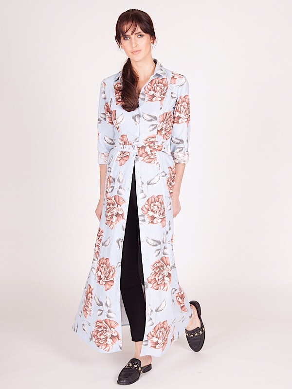 Ankle length shirt dress with flared panels. Gold buttons feature down front opening and on sleeve cuffs. Gold studded belt of itself included.