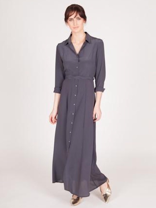 Ankle length shirt dress with flared panels. Gold buttons feature down centre front opening. Soft tie belt included.